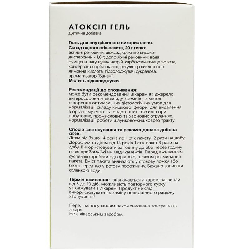 Atoxil Gel in 20 g sachets (20 pcs) is an internal detoxifier and enterosorbent containing highly dispersed silicon dioxide. It helps adsorb and remove food-borne and endogenous toxins, allergens, microbes, and harmful substances from the gastrointestinal tract, supporting digestive health after poisoning, diarrhea, dysbacteriosis, and food allergies when used as directed.