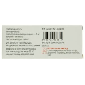 Lazine Film Coated Tablets 5 mg are a reliable over-the-counter antihistamine formulated to help reduce the symptoms of allergic reactions, including seasonal and environmental allergies, hay fever, allergic rhinitis, and other histamine-related discomforts. The active ingredient works by blocking the effects of histamine — a natural compound the body releases during allergic responses — helping relieve itching, sneezing, nasal congestion, watery eyes, and runny nose.