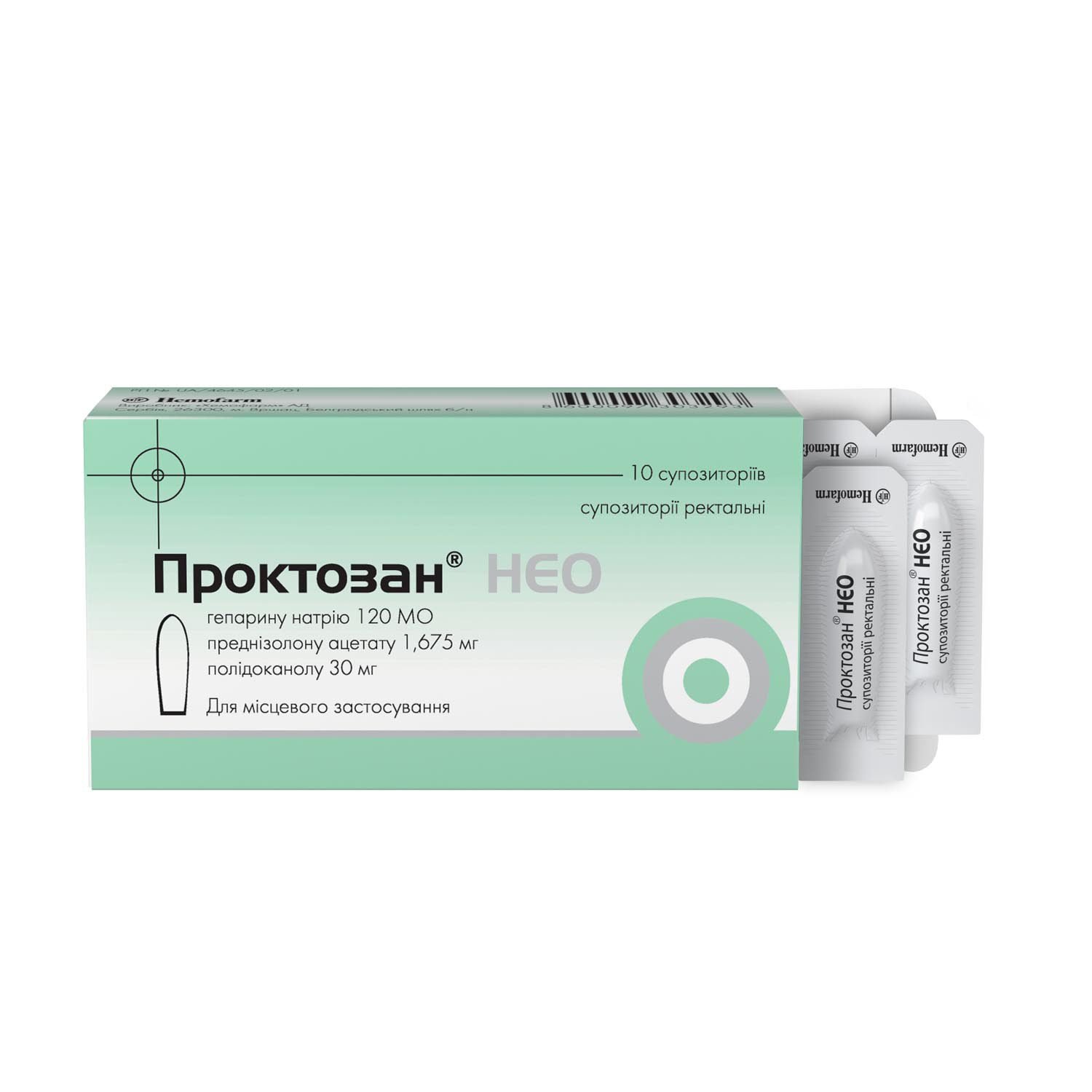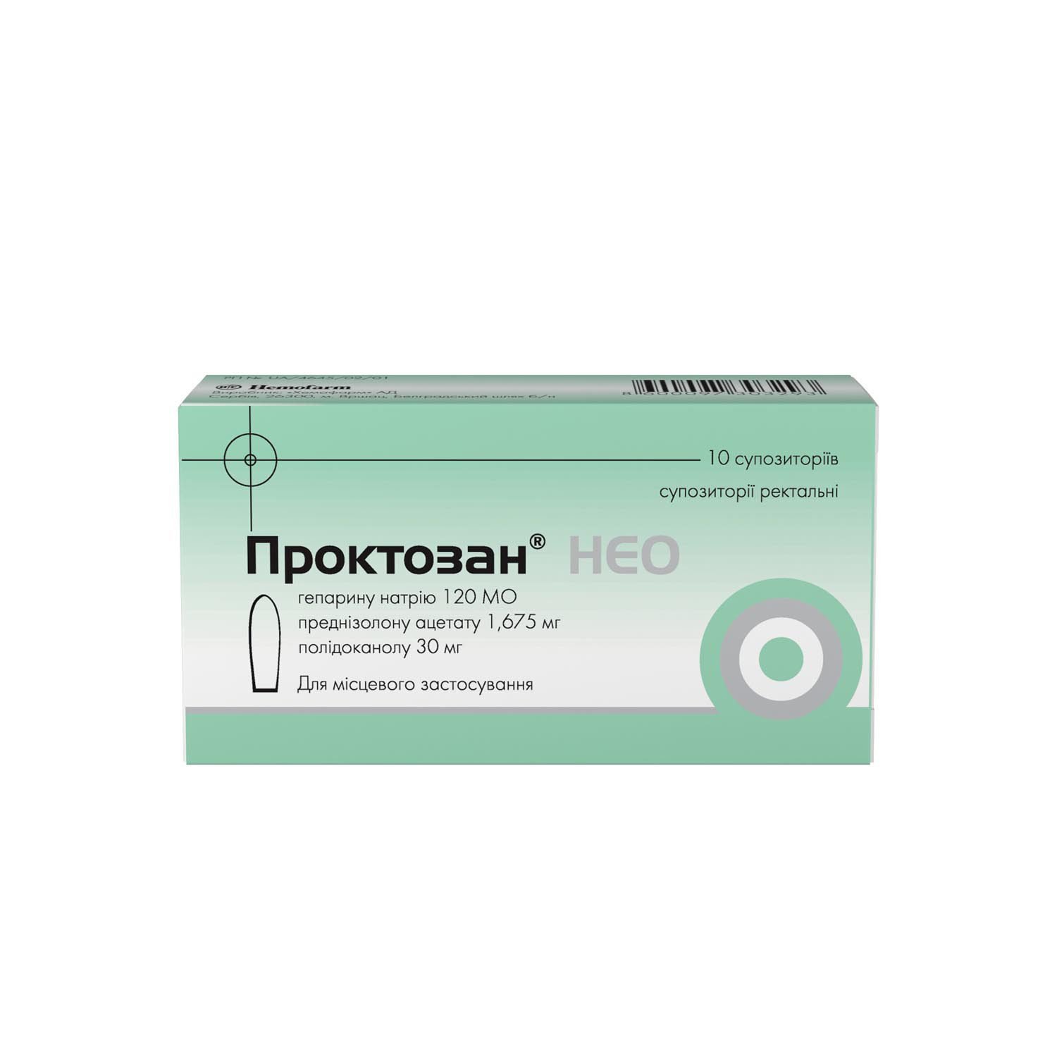 Proctosan Neo Rectal Suppositories (10 pcs) are locally acting proctological suppositories containing sodium heparin, prednisolone acetate and polidocanol to help reduce inflammation, itching, burning and pain associated with internal and external hemorrhoids. Provides targeted symptomatic relief when used as directed.