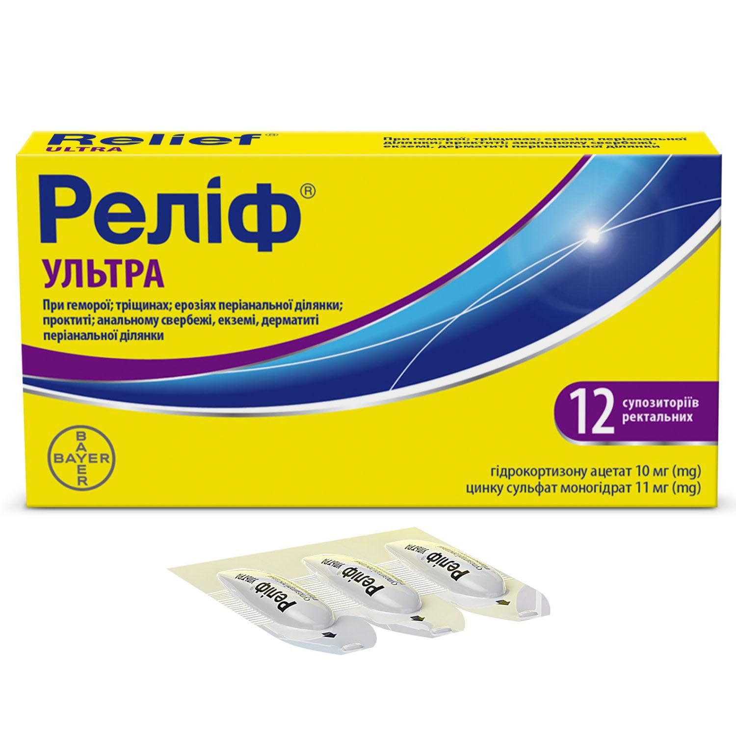 Relief Ultra Rectal Suppositories (12 pcs) are medicated suppositories containing hydrocortisone acetate and zinc sulfate designed to relieve inflammation, itching, burning and discomfort associated with hemorrhoids, anal fissures, proctitis, perianal eczema and dermatitis. Used after hygienic preparation up to four times a day.